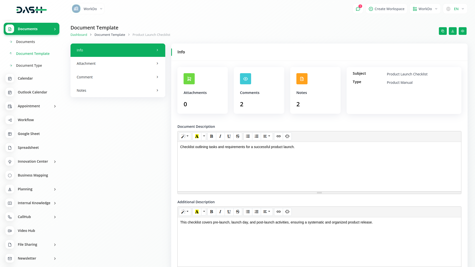 Revolutionize your document management process with Dash SaaS's Document Template Integration, designed to simplify template creation and customization. Craft personalized document templates effortlessly to suit your organization's unique needs. With intuitive controls and a user-friendly interface, defining document structures, details, tags, and parameters is a breeze, ensuring each template aligns perfectly with your workflows.
