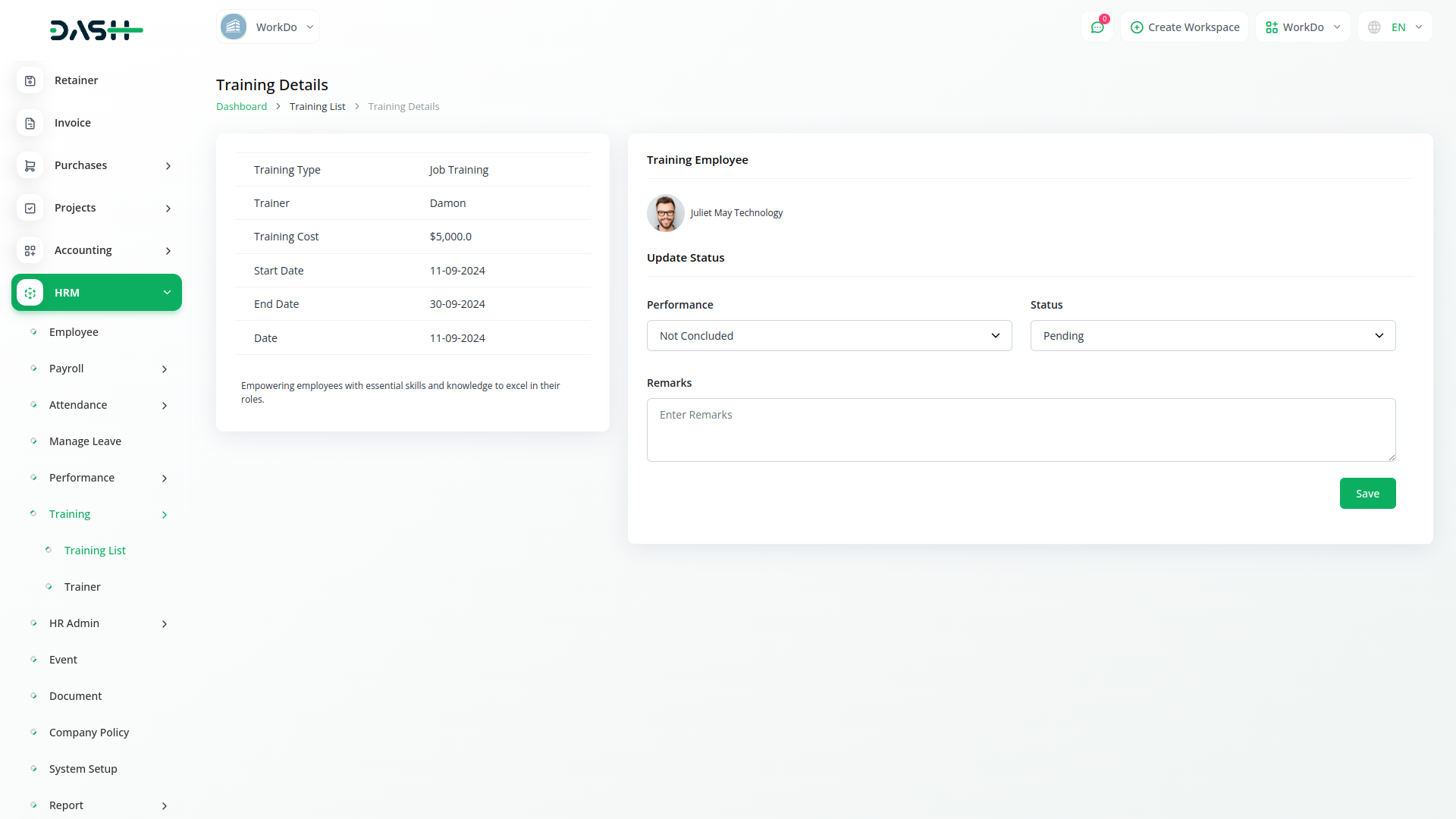 Empower employee growth. Schedule skills training, track expenses and watch your employees become better at their work.Depending on HRM Module.